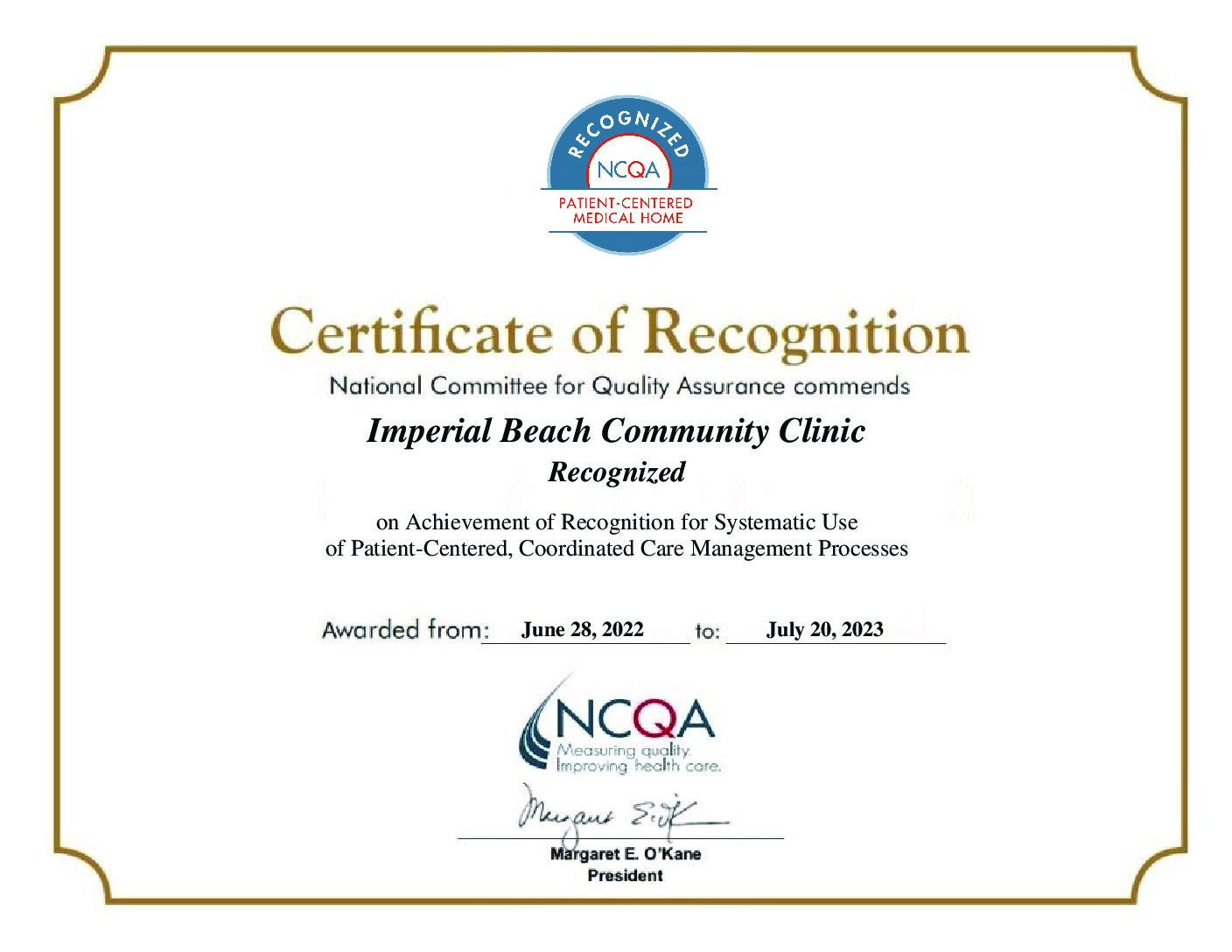 Imperial Beach Health Center and the Nestor Community Health Center, two facilities operated by Imperial Beach Community Clinic (IBCC), have achieved Patient Centered Medical Home (PCMH) status through the National Committee for Quality Assurance (NCQA).